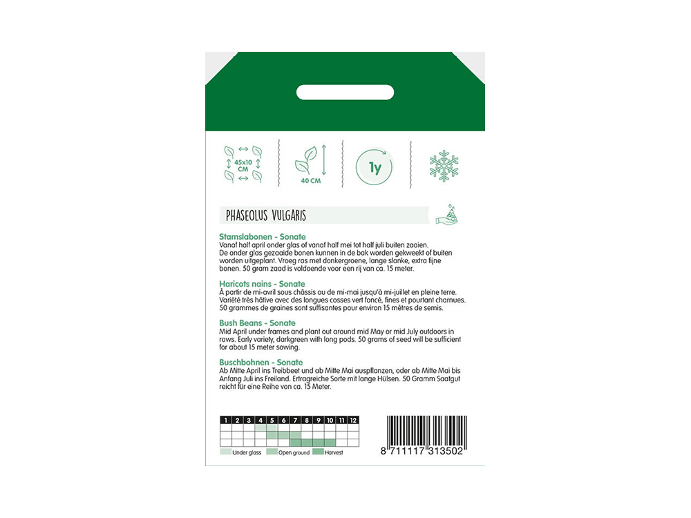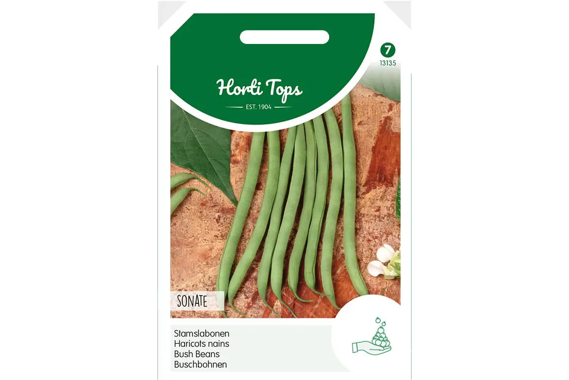 Stamslabonen Sonate is een vroeg ras met donkergroene, lange, slanke extra fijne bonen.