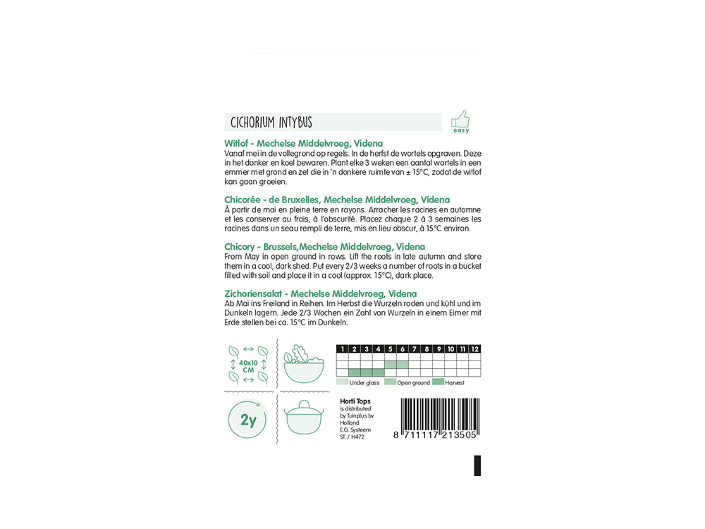 Witlof Mechelse Middelvroeg, Videna kan je vanaf juni zaaien in volle grond op regels. In de herfst de wortels opgraven en koel en donker bewaren.