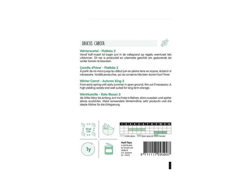 Winterwortelen Flakkée 2 is een productief ras uitermate geschikt om gedurende de winter binnen te bewaren. De lengte van deze wortelen is tussen de 20 en 35 cm en ze hebben een diameter van 2,5 tot 5 cm.