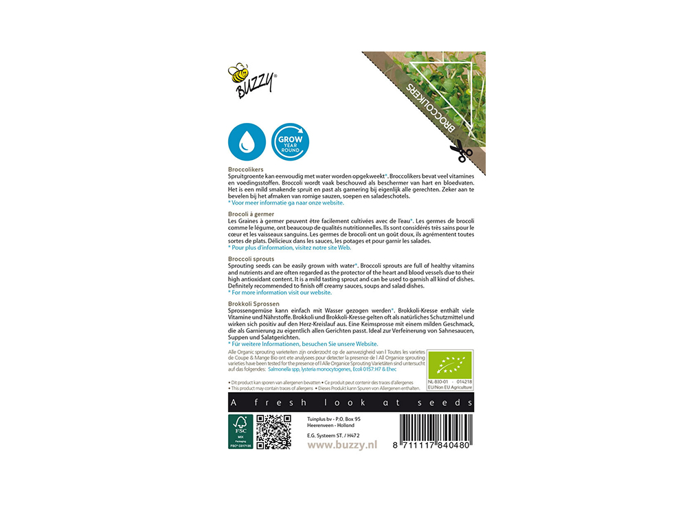 Broccolikers kun je het hele jaar door binnenshuis kweken. Deze kiemgroente zit boordevol vitaminen die goed zijn voor hart en bloedvaten. Met zijn milde smaak is broccolikers ideaal als smaakmaker in romige sauzen, soepen en salades, en kan het ook als garnering worden gebruikt.