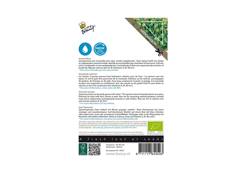 Mosterkers is een spruitgroente met een pittige en uitgesproken mosterdsmaak. De kiemspruiten smaken heerlijk op een stukje brood met kaas, beenham of leverworst. Het is ook een verrassende smaakmaker bij aardappelpuree, mosterdsoep of in verse mayonaise bij mosselen of koude kip. Spruitgroenten zijn super gezond en rijk aan calcium, ijzer en vitamine A, B1, B2 en C.