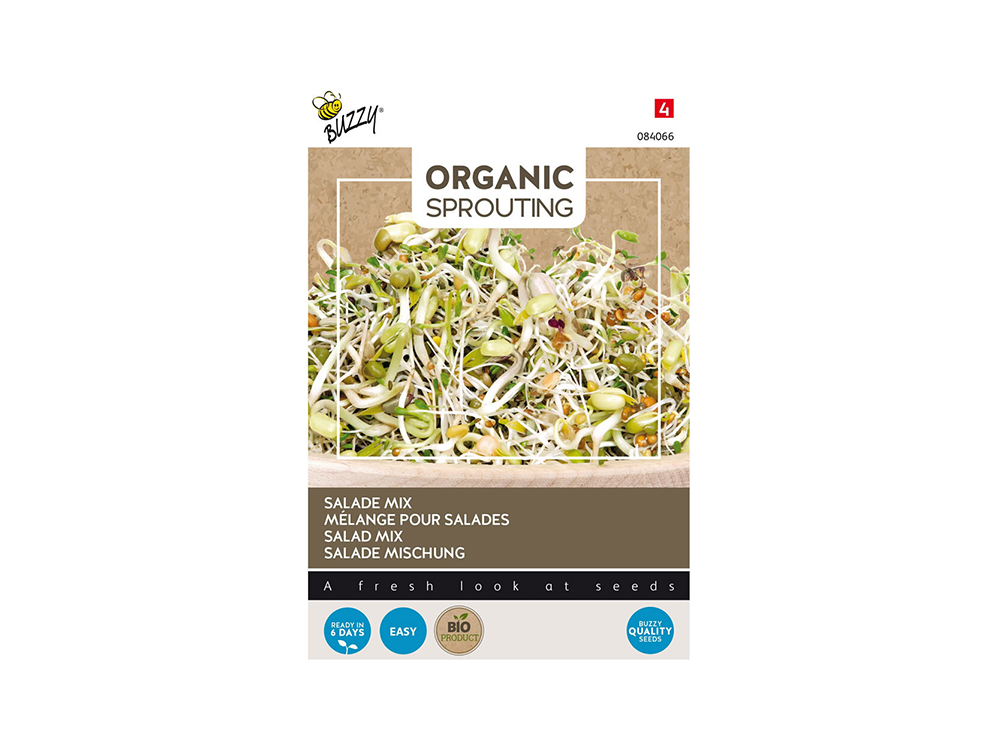 Salade Mix BIO kan het hele jaar door gekweekt worden als spruitgroente in een sprouting pot. Het is een mengeling van taugé, alfalfa, linzen, fenegriek en gele mosterd. Het is een rijke en gezonde aanvulling bij heel veel gerechten.