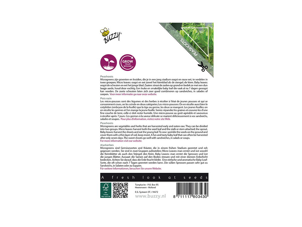 Een leuke en smakelijke baby leaf (doperwt) die vaak al na 7 dagen geoogst kan worden. De zoete scheuten laten zich zeer goed combineren op sandwiches, in salades of soepen. Het is een goed smakende, zeer productieve boon.