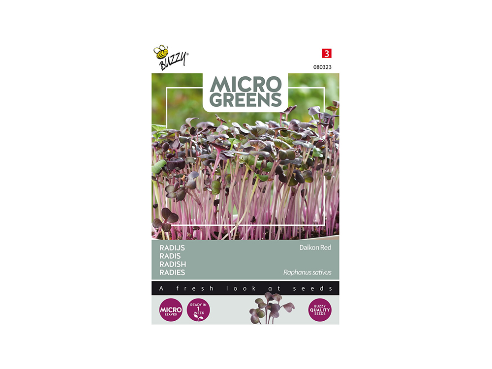 Daikon micro leaves hebben een frisse pittige smaak en zijn na circa 1 week oogstbaar. Ze zijn opvallend mooi gekleurd en goed te combineren in salades of bij warme oosterse gerechten.