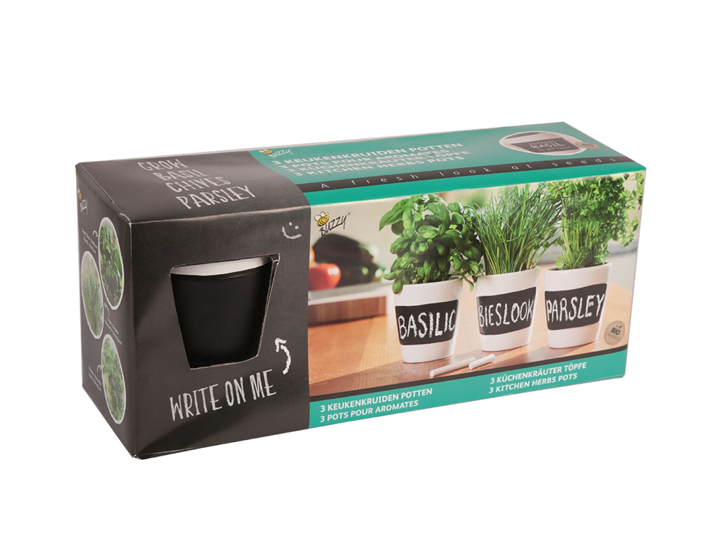 Met de basilicum-, peterselie- en bieslookzaden kun je direct beginnen. Laat de cocostabletten in lauw water zwellen tot ze verzadigd zijn en je genoeg grond hebt om de kruidenpotten te vullen. Zaai één soort per pot en plaats ze op een plek met voldoende licht en warmte.