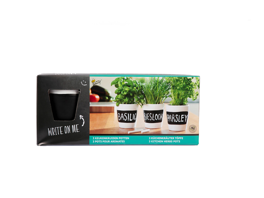 Drie prachtig met de hand afgewerkte potten die perfect staan op het aanrecht of de vensterbank in de keuken. De witte potten kunnen met het bijgeleverde krijtje keer op keer beschreven worden op het daarvoor bestemde vlak.
