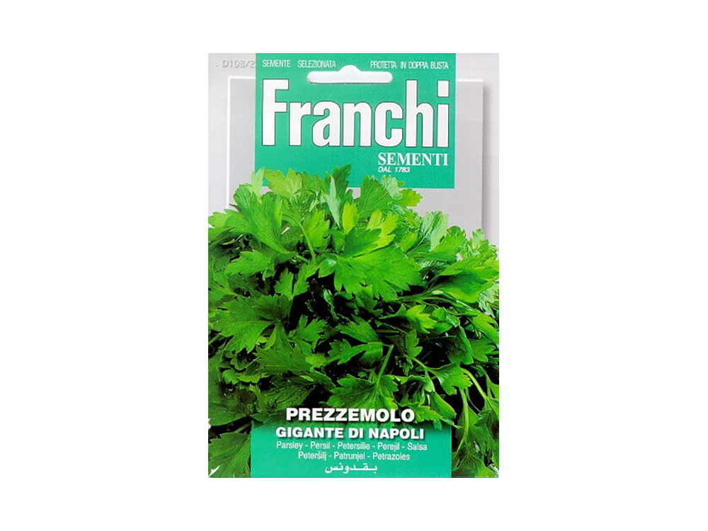 Peterselie Gigante di Napoli geeft grote platte bladeren en komt oorspronkelijk uit Napels. Het is een plukgroente, ze groeien weer aan na het plukken.