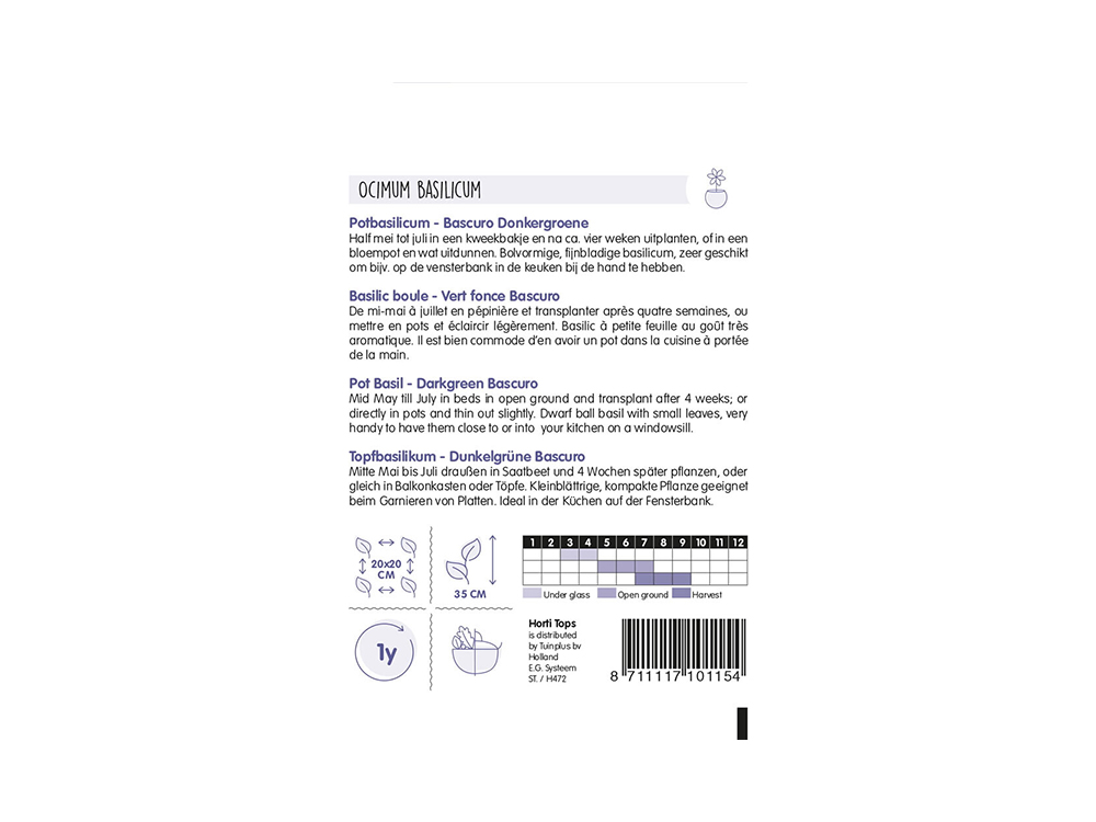Griekse Potbasilicum is het Mediterrane keukenkruid bij uitstek. De ideale éénjarige soort om in potten te zaaien op de keukenvensterbank. Wordt in de keuken gebruikt om tal van gerechten op smaak te brengen: pasta's, salades, stoofpotjes en het is uiteraard één van de hoofdingrediënten voor het maken van een heerlijke pesto.