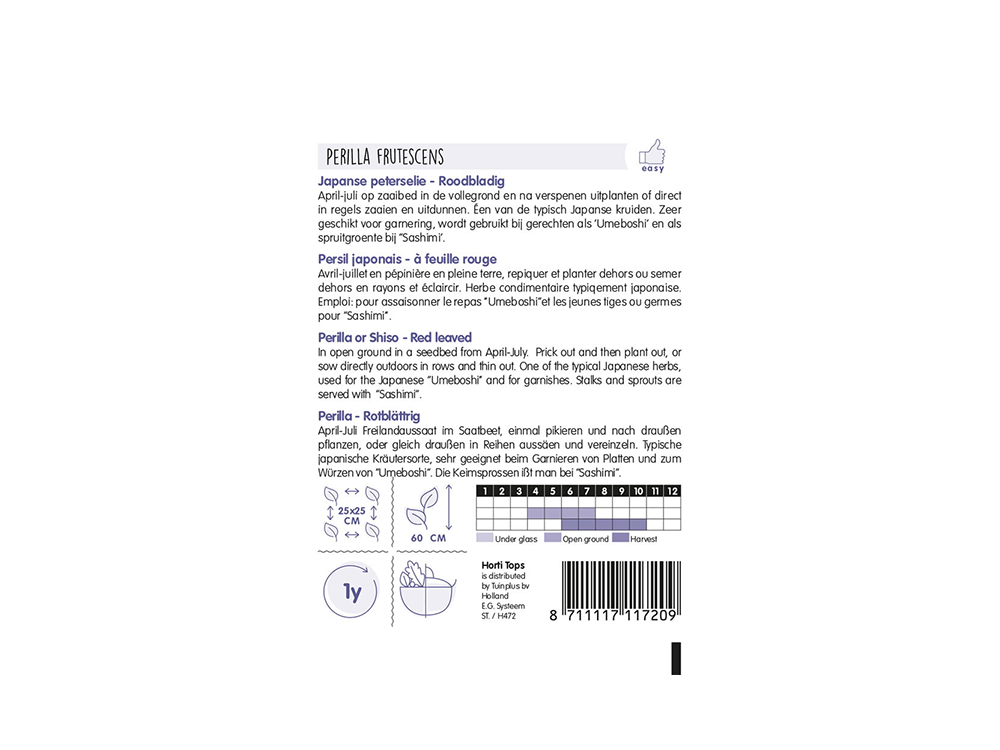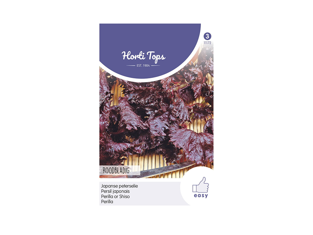 Roodbladige Japanse peterselie is een éénjarige roodbladige peterseliesoort die tot 60 cm hoog wordt. Een typisch Japans kruid dat als garnering wordt gebruikt bij gerechten als 'Umeboshi' en als spruitgroente bij 'Sashimi'.
