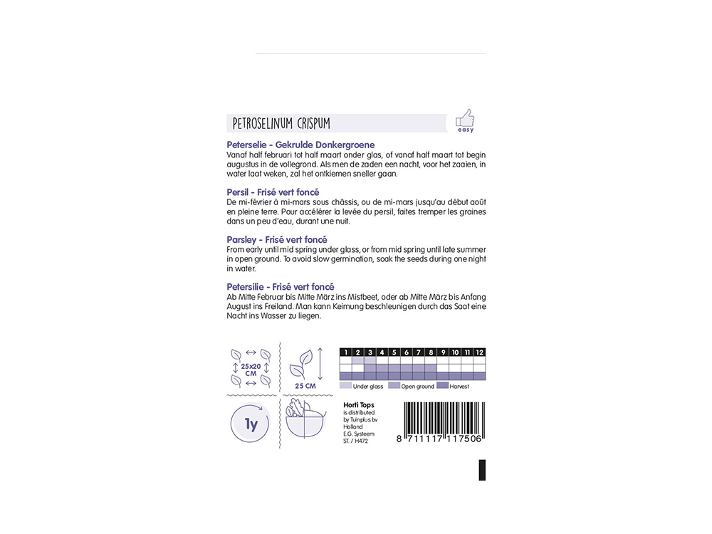 Peterselie gekrulde donkergroen is geschikt om in te vriezen, rijk aan vitaminen, calcium en ijzer. Probeer peterselie eens als thee tegen reumaklachten! Het blad is sterk aromatisch en past bij allerlei gerechten.
