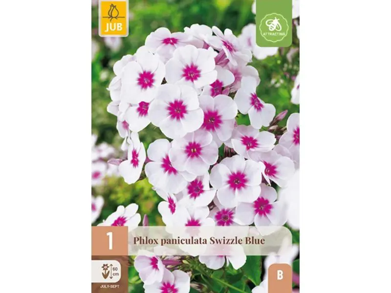 Phlox paniculata 'Swizzle Blue', ook wel vlambloem genoemd, is een fraaie vaste plant voor de tuin met wit-roze bloemen. De bloemen, die een verfijnde geur verspreiden, zijn gedraaid in de knop, bestaan uit vijf kroonblaadjes met een gaatje in het midden en trekken ook vlinders aan. De plant wordt ongeveer 50 tot 60 centimeter hoog en is zowel in de border als als snijbloem zeer geschikt.
