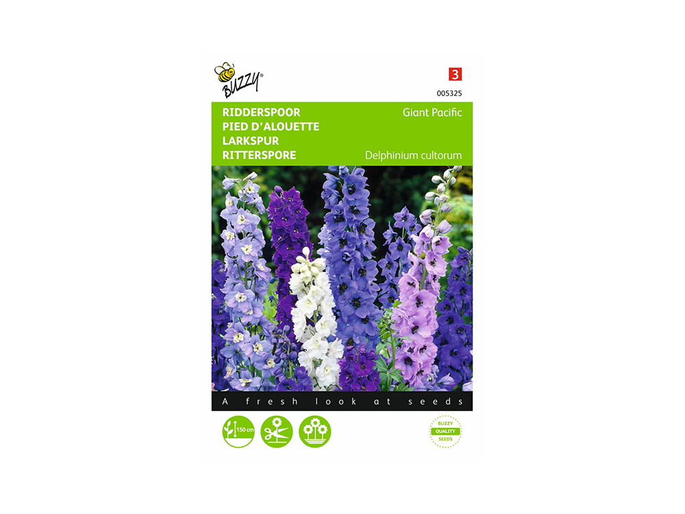 Riddersporen Giant Pacific is een meerjarige soort die tot 150 cm hoog wordt. De bloemen bloeien in een fraai kleurenmengsel van blauwe, lila, roze en witte tinten. Prachtig om in de border te verwerken en schitterend op de vaas als snijbloem.
