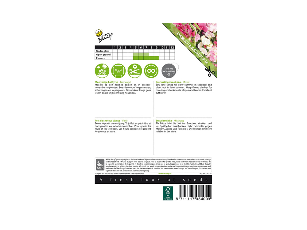 Deze meerjarige, doorlevende of vaste lathyrus van Buzzy Seeds heeft gevleugelde stengels en bladstelen. Dit zaadmengsel heeft rode, roze en witte bloemen, die in trossen bij elkaar zitten. Het blad is lancetvormig. Groeit schitterend langs hekwerk, gaas, schuttingen en ander steunmateriaal. Ook een mooie snijbloem.