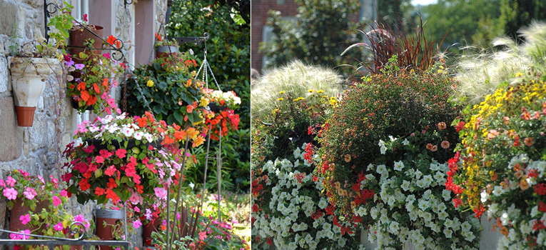 Op een terras of balkon met weinig plaats zorgen hangmanden voor een massa bloemen op ooghoogte, zonder dat ze plaats innemen.