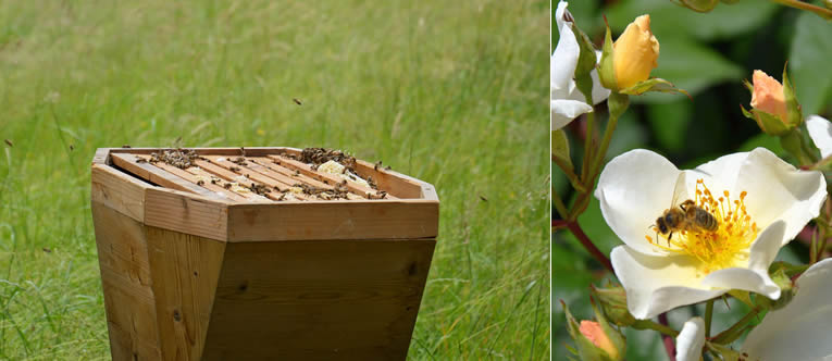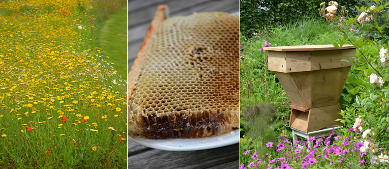 Zorg dat er in en rond je tuin veel, liefst inheemse, bloemen groeien. Want bijen vliegen wel tot 3 kilometer ver maar bij slecht weer blijven ze binnen een straal van 500 meter. Als ze daar niet genoeg nectar vinden, verhongeren ze. Zorg dat er tussen maart en november altijd wat bloeit in je tuin. Vlinderstruiken, sporkehout (of vuilboom) en bramen barsten van de nectar, net als acacia, zwarte els, hazelaar, tamme en wilde kastanje, wilg, linde en esdoorn. Een haag van meidoorn en sleedoorn is zeer interessant voor bijen. In de borders zijn sierdistels, lavendel, de dropplant, vrouwenmantel en leverkruid bijvoorbeeld populair. Heb je een wat grotere tuin, leg dan een graslandje aan met wilde margrieten, korenbloemen en klavers aan, en een paar fruitbomen. Daar profiteren overigens niet alleen de honingbijen, maar ook de solitaire bijen van, een bijzonder vreedzame soort die alleen woont, in holletjes in de grond of spleten in muren. Ze vliegen van bloem tot bloem, terwijl honingbijen zich veel meer focussen op één soort bloem die op dat moment bloeit: linde, klaver, acacia... Hommels hebben een langere tong, en vliegen al heel vroeg uit, vanaf februari, waardoor ze weer heel andere bloemen zoals krokussen opzoeken