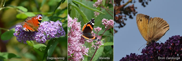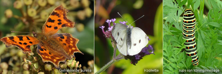 In een doorsneetuin fladderen gemiddeld zo’n zes soorten vlinders rond. Het bekendst is wellicht het koolwitje, maar ook de atalanta, kleine vos, citroenvlinder en het gamma-uiltje zijn courante tuinvlinders. De dagpauwoog is misschien wel de opvallendste. Van begin maart tot eind mei zoekt hij de warmste hoeken van je tuin op. Zijn favoriete plek op een zonnige maar nog koude lentedag is de zuidelijkste ‘helling’ van een molshoop. Hoe meer beschutting je tuin biedt, hoe meer dagpauwogen. Hun rupsen zijn fascinerend zwart met witte spikkels en lang zwarte stekels rondom. Hoe cru het ook klinkt: het aantal vlinderrupsen bepaalt mee hoeveel mezen er in je tuin komen. Die rupsen vormen immers een belangrijk onderdeel van het menu van jonge mezen. De ene zijn dood is de andere zijn brood – ook dat is de natuur.