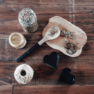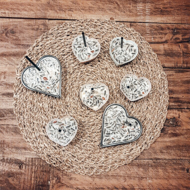 - Leg de hartvormpjes op een bakplaat en vul ze met het vogelzaadmengsel.