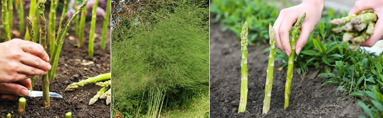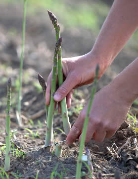 In het vroege voorjaar kunnen de asperges worden aangeplant, waarbij jonge planten het beste resultaat opleveren. Het eerste jaar mag je nog niet oogsten en de oogst in het tweede jaar zal nog niet optimaal zijn. Pas in het derde jaar kan je maximaal oogsten. Oogst de groente als ze 15 à 20 centimeter groot zijn door ze net aan het oppervlak af te breken of te snijden met . Na 10 tot 12 jaar zijn de planten uitgeput en kun je best nieuwe planten op een ander plekje in de tuin.