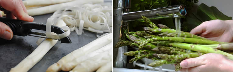 Voor het koken moeten witte asperges goed geschild worden met een dunschiller. Houd de asperge vast bij het kopje en schil van boven naar beneden, rondomrond. Om te controleren of je goed geschild hebt, breek je een stukje van de onderkant af. Als er nog draadjes meekomen, schil je best nog wat zachtjes verder met je dunschiller. Groene asperges hebben een veel dunnere schil en hoeven niet geschild te worden maar spoel je gewoon even af onder stromend water.