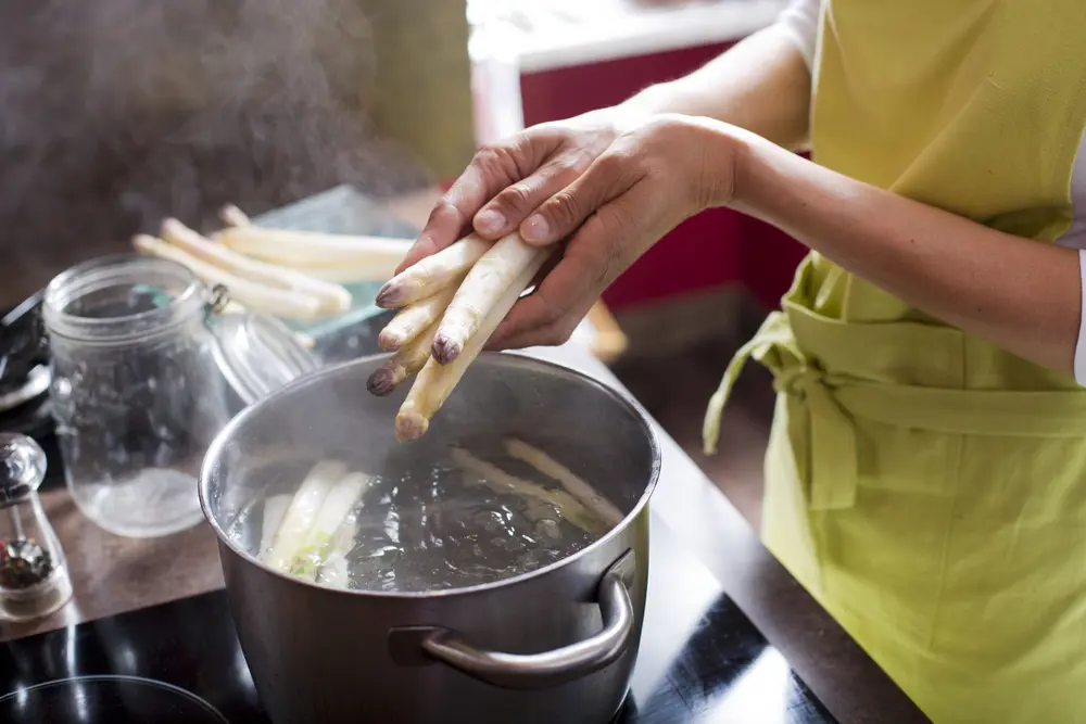 Voor het koken moeten witte asperges goed geschild worden met een dunschiller. Houd de asperge vast bij het kopje en schil van boven naar beneden, rondomrond. Om te controleren of je goed geschild hebt, breek je een stukje van de onderkant af. Als er nog draadjes meekomen, schil je best nog wat zachtjes verder met je dunschiller. Groene asperges hebben een veel dunnere schil en hoeven niet geschild te worden maar spoel je gewoon even af onder stromend water.
