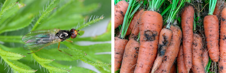 Zoals zijn naam doet vermoeden heeft de wortelvlieg (Psila rosae) het gemunt op wortelen in de moestuin. Maar ook pastinaak, wortelpeterselie, venkel, selderij, knolselder, peterselie en dille blijven niet gespaard van dit insect. De vlieg is 5 tot 6 mm lang en heeft een zwart, groenachtig slank lichaam. Zijn kop is roestbruin en het achterlijf korter dan de vleugels. De poten zijn oranje van kleur.