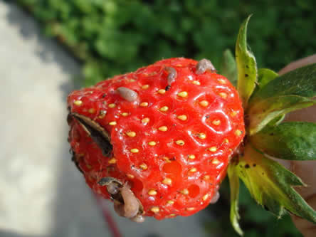 Aardbeien beginnen te rijpen vanaf eind mei, maar wanneer het veel regent kunnen slakken opduiken en alvast beginnen smullen van deze lekkernijen. Het is ongeloofelijk wat slakken (en ook andere insecten) op 1 nacht kunnen opeten. Ze kruipen op de aarbeien en vreten er gaten in.