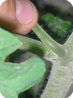Stap 2: De dief tussen duim en wijsvinger nemen : U neemt een zijscheut (dief ) en plooit, scheurt die naar linker- of rechterkant. Let wel! niet met een mes want zo brengt u ziektes over van plant tot plant.