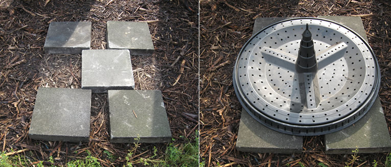 - Plaats enkele betontegels (5 tot 9) als stabiele basis, leg er zeker een in het midden opdat de bodemplaat niet doorzakt en breekt want een vol vat kan al snel 100 kg wegen. Laat enkele centimeters opening tussen de stenen om een goede verluchting en drainage te garanderen.
