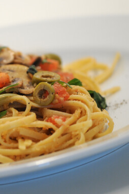 - Voeg bij de pasta de tomaten, amandelkruimeltjes, gebakken champignons, olijven, verse basilicum en het overige citroensap toe. Breng verder op smaak met peper en zeezout.