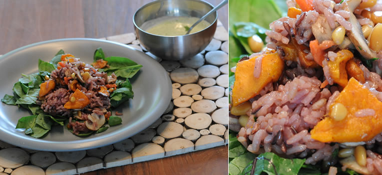 - Leg op je bord wat blaadjes spinazie en schep er de rijst bovenop. Serveer samen met het koele sausje en geniet van dit heerlijk recept.