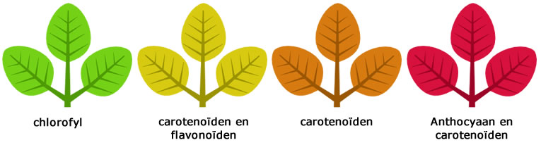 - Flavonoïden en carotenen zijn altijd terug te vinden in bladeren. Xanthofylen zijn een onderdeel van de carotenen en zijn verantwoordelijk voor de gele kleur van herfstbladeren.
