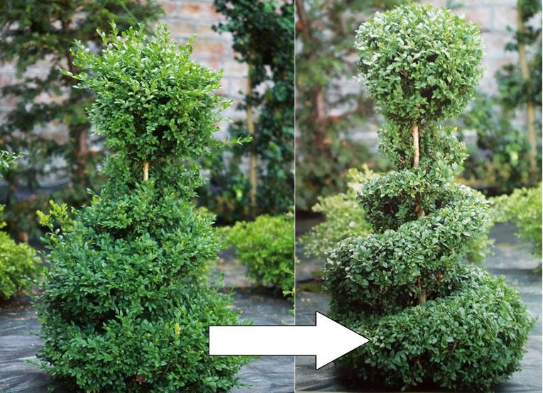 Misschien denk je dat het te lastig of tijdrovend is om ingewikkeld vormsnoeiwerk te maken, zoals een spiraal met bol. Gelukkig kun je struiken kopen die al in de juiste vorm zijn gesnoeid. Zet ze als ornament in ruime potten of op je terras of plant ze in een border als blikvanger.
