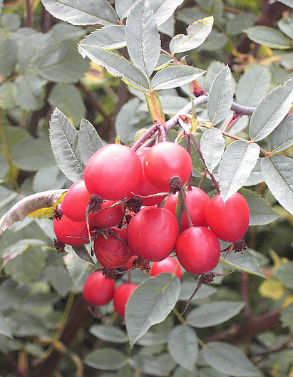 Rosa rugosa, de Japanse bottelroos of rimpelroos, uit China. Tot een meter hoog, met gerimpeld blad en met stekels en borstels op de scheuten. Grote, dieproze bloemen, dikke oranje tot rode bottels. Perfect als ondoordringbare haag.