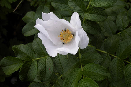Rosa pimpinellifolia, de duinroos, bloeit, wit, roze of gelig in mei-juni. Zwarte bottels. Hiervan worden vooral hybriden toegepast.