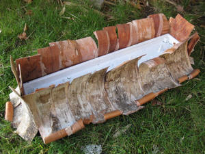Knip of scheur ongeveer gelijke schorsrepen en speld deze op de isolatieplaat. Zorg dat je een rechtopstaande rand hebt van een aantal centimeter.