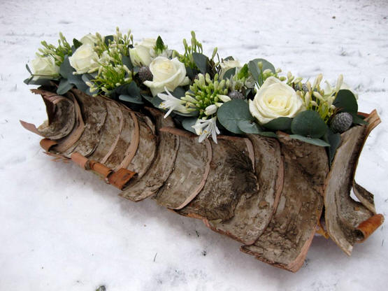 Winters bloemstuk met repen boomschors