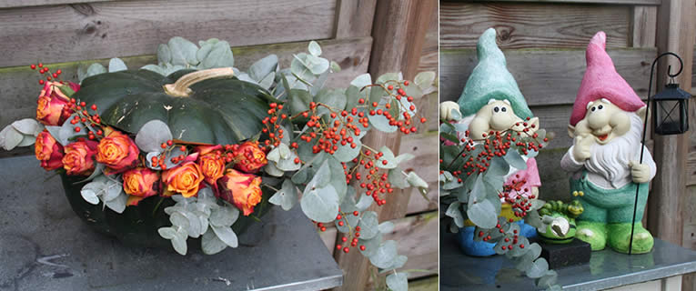Vul een pompoen met rozen en Eucalyptus. Lees hier wat je precies allemaal nodig hebt en hoe je te werk gaat om het te maken.