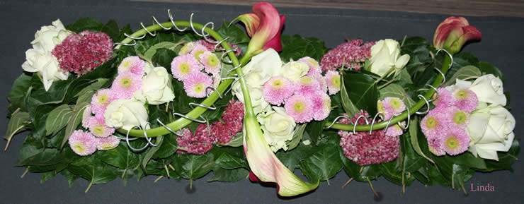 - Als finishing touch maak je rond de stengel van de calla’s een spiraal met de aluminiumdraad en steekt deze met een lichte boog over het geheel.