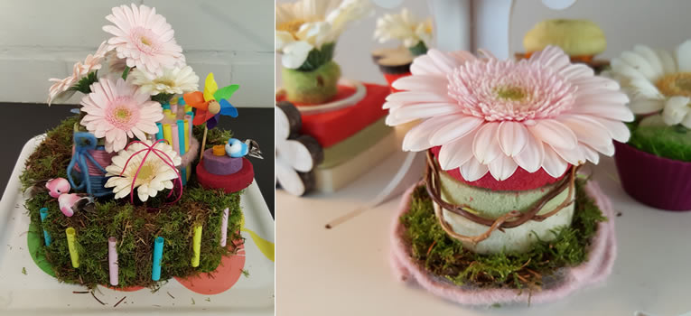 - Prik met behulp van een lange etalagespeld en parel de houten bloem op je “taartje”