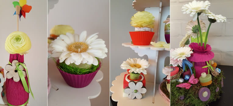 Plaats een aantal afgewerkte stukjes op je groen dienblad en versier verder met rietjes, gekleurd steekschuim in verschillende vormpjes, vogeltjes , vlindertjes, houten bloemen, … chocolade-eitjes….