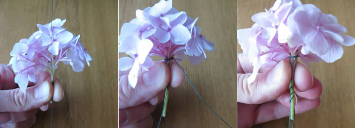 - Leg een corsagedraad of anjerdraad in het verlengde van je toefje. Hou de bloemen een beetje samen en wikkel net boven je duim de draad een 3 tal keer. Ga vervolgens met de draad onder je duim en wikkel zo naar beneden. Knip beide draadjes af. Die lopen nu evenwijdig met het steeltje van de Hortensia en zullen ervoor zorgen dat dit wel makkelijk in het steekschuim te verwerken is.