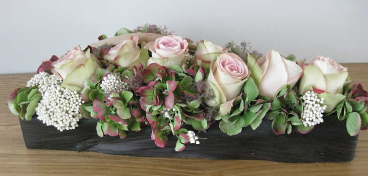 Andere materialen die je eventueel hierin kan verwerken is: witte sneeuwbes met bijvoorbeeld rode rozen. Tuinmaterialen: Een rankje van de clematis, Sedum, Malus appeltjes, besjes, Viburnum bessen, Hypericum bessen, een mooie tak hierin verwerken, stukjes plataanschors….