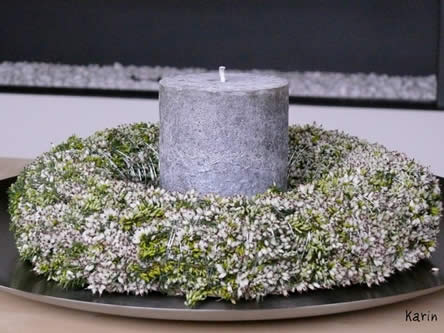Kransen zijn er in soorten en maten. Voor deze krans is een strokrans gebruikt en witte Erica carnea. Door de afgewerkte krans op een inox schaal te leggen en een kaars in een "koude" kleur te gebruiken wordt op die manier de winterse sfeer nog eens benadrukt. Dit bloemwerk staat ook erg mooi op de kersttafel.