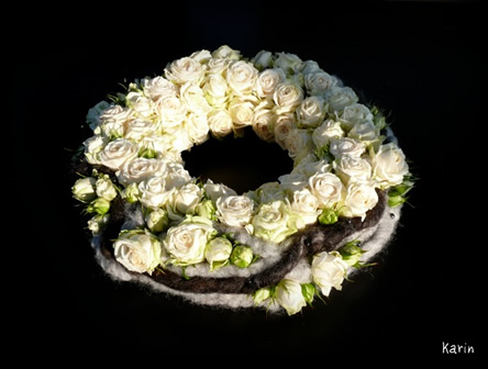 Hier een voorbeeld van een modern grafstuk met trosroosjes en wol op een krans ---> een cirkelvorm, symbool van oneindigheid, het niets of absolute vrijheid.