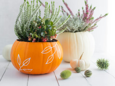 - Planten in de pompoen planten: om zo lang mogelijk van je beplante pompoen te kunnen genieten, moet je de binnenkant van de uitgeholde pompoen met wat haarlak inspuiten of bedekken met een laagje vernis. Eenmaal alles opgedroogd is, kan je de pompoen met potgrond vullen. Hierin kan je jouw favoriete herfstbloemen aanplanten.
