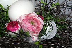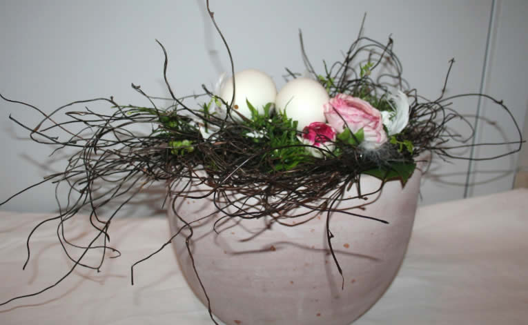 • De ganzeneieren, veertjes op draad en mullembechia zijn te koop in de betere tuincentra.