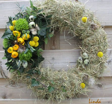 Deze krans is vastgemaakt met de binddraad aan een bamboestok en in een pot waar (droge)oude stukken steekschuim in gestoken zijn, je kunt de pot ook met zand vullen, de bedoeling is dat de stok stevig vast zit. De bloemen zijn vervangen door eierschalen gevuld met knolletjes. De eitjes en schalen zijn ook hier gelijmd