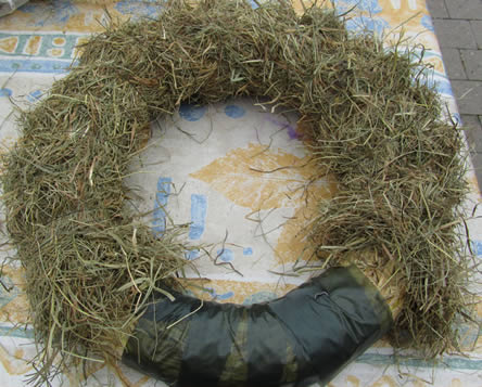 - Neem de plukken hooi en legt ze naast elkaar tegen de strokrans, omwikkel met de binddraad.