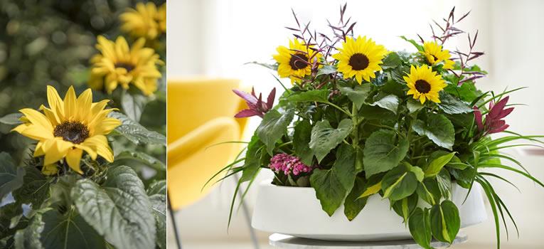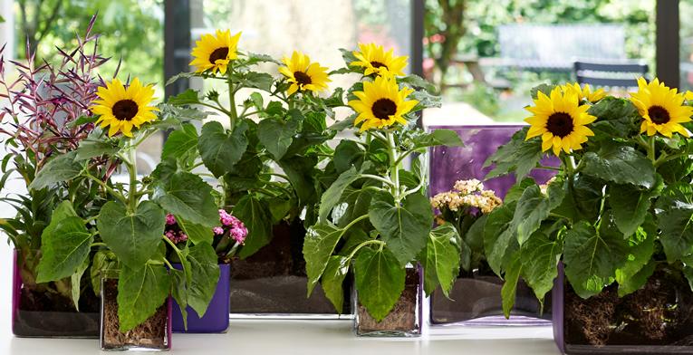 De potzonnebloem ‘Sunsation’ is ideaal voor balkon, terras of interieur. De plant wordt niet zo hoog als de tuinvariant, want die groeit met gemak naar twee meter lengte. De Sunsation blijft lekker compact met zo’n 40 centimeter hoogte. Daardoor kun je de vrolijke, felgele bloem met het donkerbruine hart goed zien. Zet er een paar bij elkaar in een bak of in een groepje, voor het effect van een bloeiend zonnebloemenveldje. Daar mag gerust een vleugje lila of paars bij, om al het geel wat af te koelen.