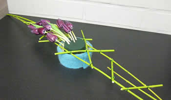 - Leg het takkenframe op je recipiënt. Nu kan je je groenmaterialen verwerken. De tulpen liggen al een tijdje uit het water dus zullen ze makkelijker buigen. Snij ze wel eerst terug recht aan zodat ze snel water kunnen opnemen. Verwerk de tulpen aan beide zijden van lang naar kort. De iets langere tulpen rusten op je cornus frame.